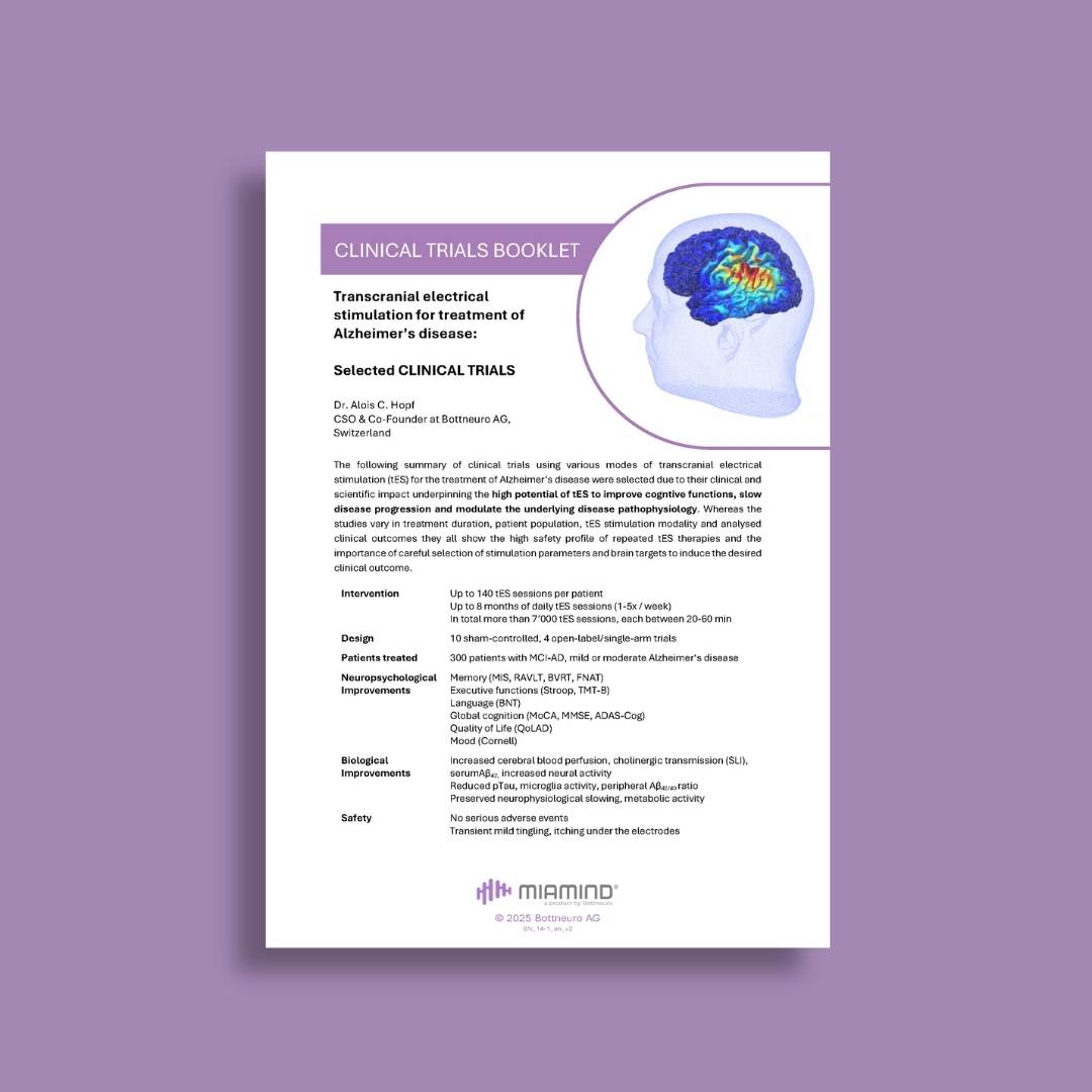 Studies indicate that tES may be effective in various neurological and psychiatric disorders. Particularly in dementia treatment and cognitive impairments, promising results are observed. With Miamind®, these approaches are further researched and optimized within personalized neurostimulation through individual adaptations for each patient.